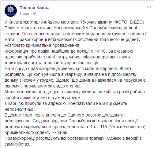 В Киеве в квартире на улице Нововокзальной в Соломенском районе столицы найдена мертвой 15-летняя девушка. Информация о происшествии поступила в полицию в 14:10. Мать потерпевшей рассказала, что когда вошла в квартиру, обнаружила на полу мертвую дочь с ножом в груди.