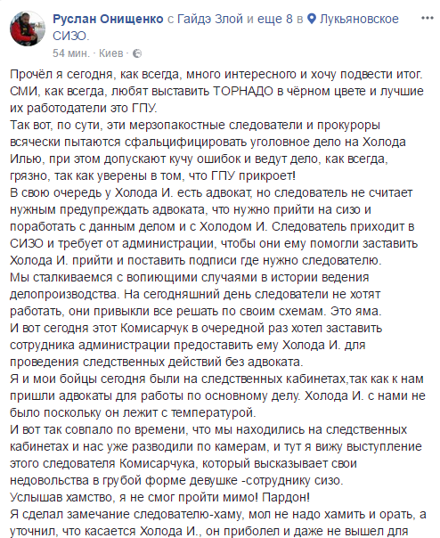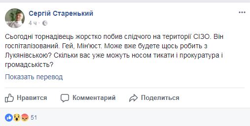 "Сегодня "торнадовец" жестко избил следователя на территории СИЗО. Он госпитализирован. Эй, Минюст. Может уже будете что-то делает с Лукяновкой? Сколько вас уже могут носом тыкать и прокуратура и общественность?",  - пишет Старенький.
