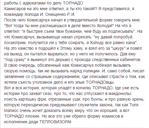 Он не уточняет, по какому делу проходит бывший торнадовец. Но затем в комментриях уточняет, что избитый - следователь Шевченковского райотдела полиции.