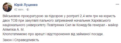 "Военной прокуратурой по подозрению в растрате 2,4 млн грн в пользу двух ООО при закупке горючего задержан начальник Харьковского национального университета Воздушных сил им Кожедуба генерал-майор Алимпиев А. М. Будем ходатайствовать об аресте и отстранении от занимаемой должности", - написал он в своей странице в соцсети Facebook в пятницу вечером.