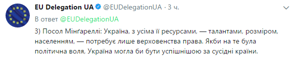 Глава Представительства ЕС также отметил, что Украина, со всеми ее "ресурсами, талантами, размером, населением, требует лишь верховенства права".