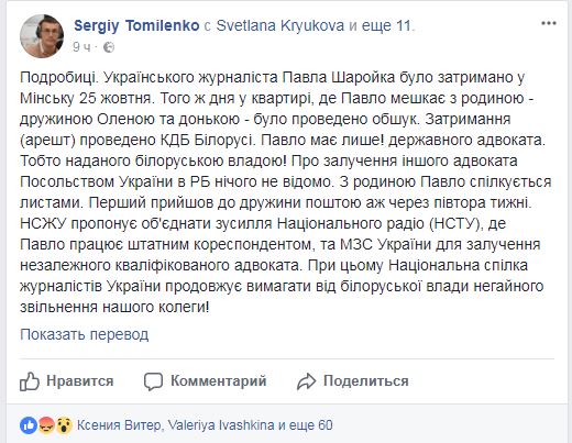 "В квартире, где проживает журналист со своей супругой Еленой и дочерью, провели обыск. Задержание осуществили сотрудники КГБ Белорусии 25 октября", - написал в Facebook глава Союза Сергей Томиленко.