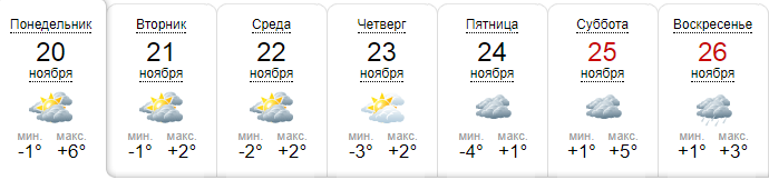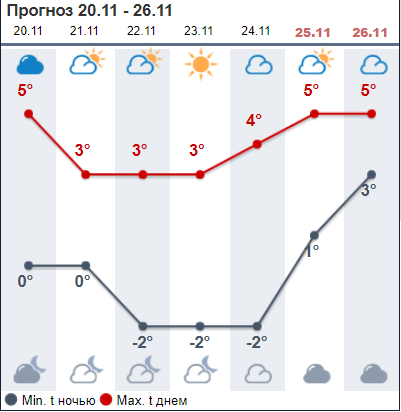 Эта неделя начнется с +5...+6 днем, затем похолодает до +2...+3. А на выходных термометры вновь покажут +5...+6. Мнения синоптиков по поводу осадков разделились. Большинство ресурсов считают, что в четверг, 23 ноября будет солнечно, а в воскресенье, 26 ноября, возможен дождь.