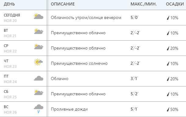 Сайт Weather.com обещает солнечный четверг, проливной дождь в воскресенье и переменную облачность в остальные дни. В понедельник и выходные днем +5, со вторника по пятницу +2...+3.