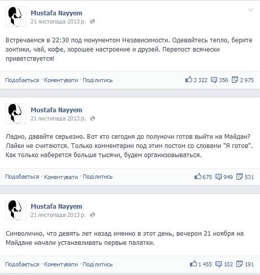 В этот день тогда активист и журналист, а ныне нардеп Мустафа Найем написал свой исторический пост в Facebook с призывом выйти на Майдан. Точнее поста было два. Первый прощупывал почву - в нем Найем предложил отметиться тем, кто готов выйти.