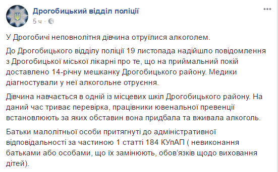 В Дрогобычский отдела полиции 19 ноября поступило сообщение из Дрогобычской городской больницы о том, что на приемный покой доставили 14-летнюю девочку. Медики диагностировали у нее алкогольное отравление.