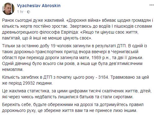 "Только за последние сутки 19 человек погибли в результате ДТП", - пишет он.