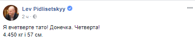 Народный депутат от "Самопомочі" Лев Пидлисецкий в четвертый раз стал отцом. Этой радостной новостью он поделился в Facebook.