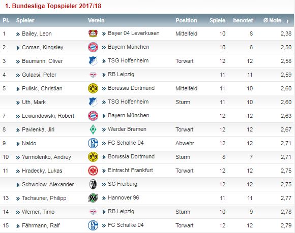 Вторую позицию с показателем 2,50 занял полузащитник "Баварии" Кингсли Коман, третью - голкипер "Хоффенхайма" Оливер Бауманн (2,58).