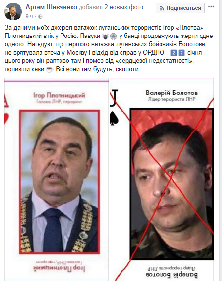 "По данным моих источников главарь луганских террористов Игорь "Плотва" Плотницкий сбежал в Россию", - написал Шевченко. И напомнил, что первого главаря луганских боевиков Болотова не спасла бегство в Москву и отход от дел - 27 января этого года он внезапно там и умер от сердечной недостаточности, попив кофе.