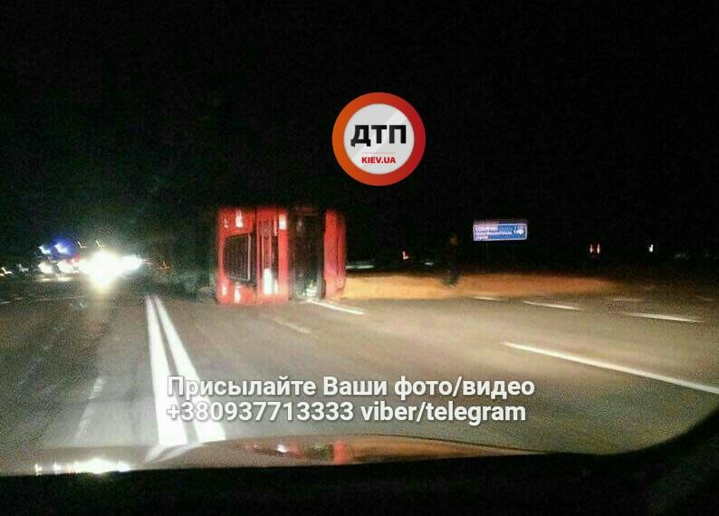 Пожилые люди переходили дорогу по центру дороги, возле поворота на Сокирин. Водитель фуры пытался их объехать, при этом машина вылетела на встречную полосу и перевернулась.