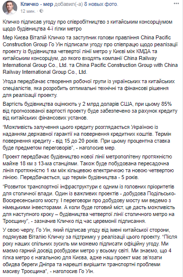 "Виталий Кличко и председатель правления China Pacific Construction Group го Уин подписали соглашение о сотрудничестве по реализации проекта по строительству четвертой линии метро в Киеве между КГГА и китайским консорциум, в который входят компании China Railway International Group Co., Ltd. и China Pacific Construction Group with China Railway International Group Co., Ltd", - говорится в сообщении.