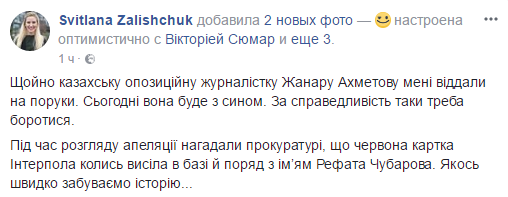 Оппозиционная журналистка из Казахстана Жанара Ахмет (Ахметова), ранее арестованная в Украине, освобождена под поручительство народного депутата Украины (фракция "Блок Петра Порошенко") Светланы Залищук.