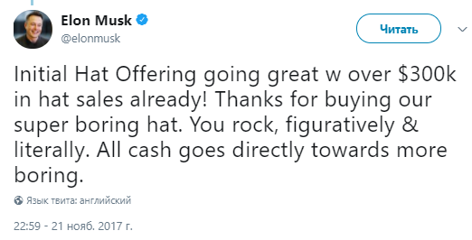 "Первичное размещение кепок (отсылка к ICO - Прим.Ред.) принесло уже больше 300 тысяч долларов! Спасибо за покупку наших супер скучных кепок. Вы крутые, образно и буквально. Вся выручка пойдет на более скучные вещи", - написал Маск.