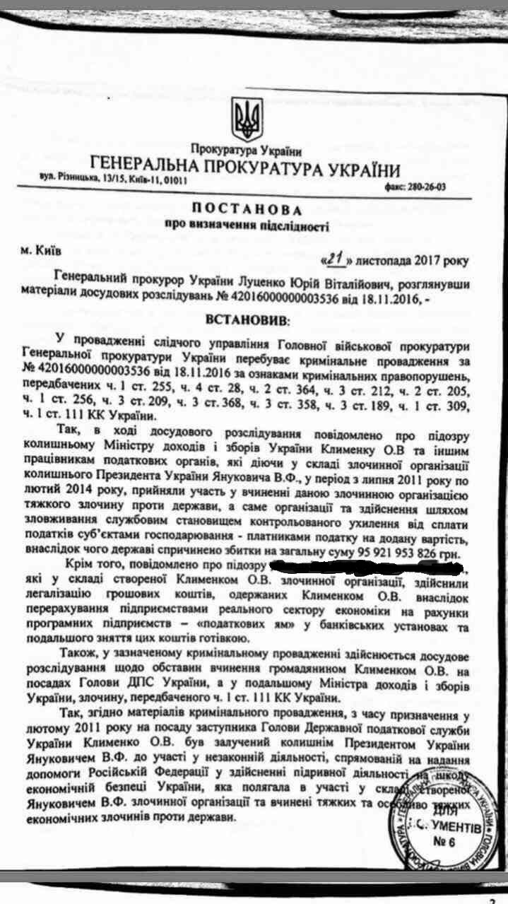 Из его текста следует, что на Резницкой признают факт утраты следственных полномочий сотрудниками органов прокуратуры (в том числе и военной), после 20 ноября по делу Клименко, фигурантам которого вменяется создание и работа налоговых площадок, в результате деятельности которых бюджету был нанесен ущерб в размере 96 млрд. грн.