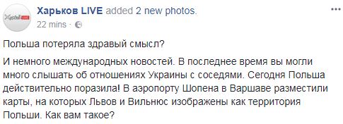 "В последнее время вы могли много слышать об отношениях Украины с соседями. Сегодня Польша действительно поразила! В аэропорту Шопена в Варшаве разместили карты, на которых Львов и Вильнюс изображены как территория Польши. Как вам такое?", - говорится в сообщении.