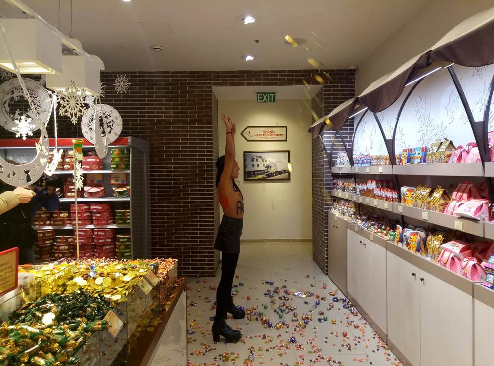 Активистка Femen Анжелина Диаш, показавшая грудь Петру Порошенко и Александру Лукашенко, ворвалась в магазин "Рошен" возле Бесарабского рынка с акцией протеста.