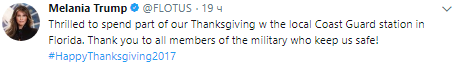 День благодарения Дональд Трамп провел вне Белого дома. Президент США вместе с супругой посетили базу береговой охраны во Флориде, а затем отметил праздник в особняке городка Палм-Бич, в домашнем кругу. Об этом пишет Elle.