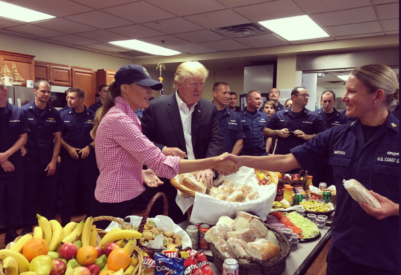 Мелания Трамп выбрала непривычный для себя простой и демократичный образ: прямые черные брюки, кепку и рубашку J. Crew за 75 долларов. А каблуки первая леди сменила на кеды.