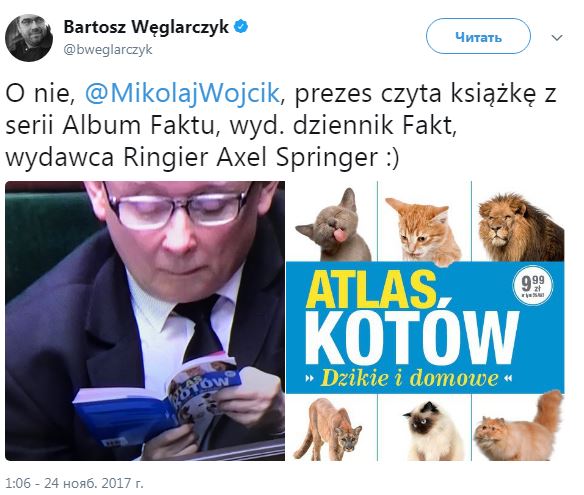 "Сегодня в Сейме состоится важное голосование по Верховному суду и Государственному судебному совету. Однако не все депутаты этим заинтересованы. Камеры выхватили момент, на котором глава партии "Право и справедливость" Ярослав Качиньский во время заседания читает "Атлас котов", - отмечает издание.