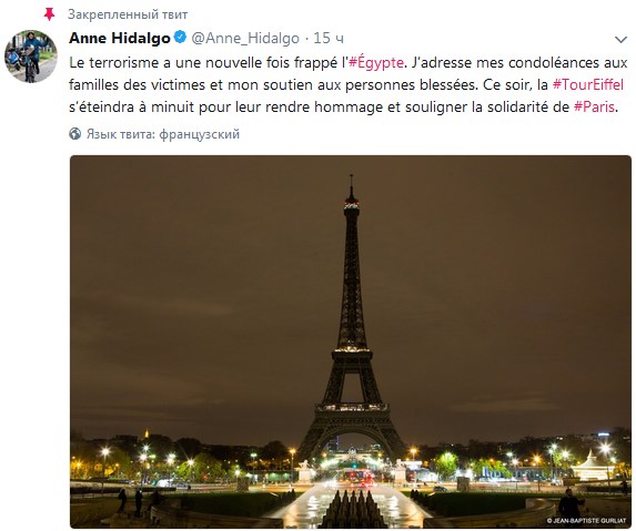 "Я выражаю соболезнования семьям жертв и поддержку пострадавшим. Сегодня в полночь огни Эйфелевой башни погаснут в знак траура по жертвам в Египте", - написала она.