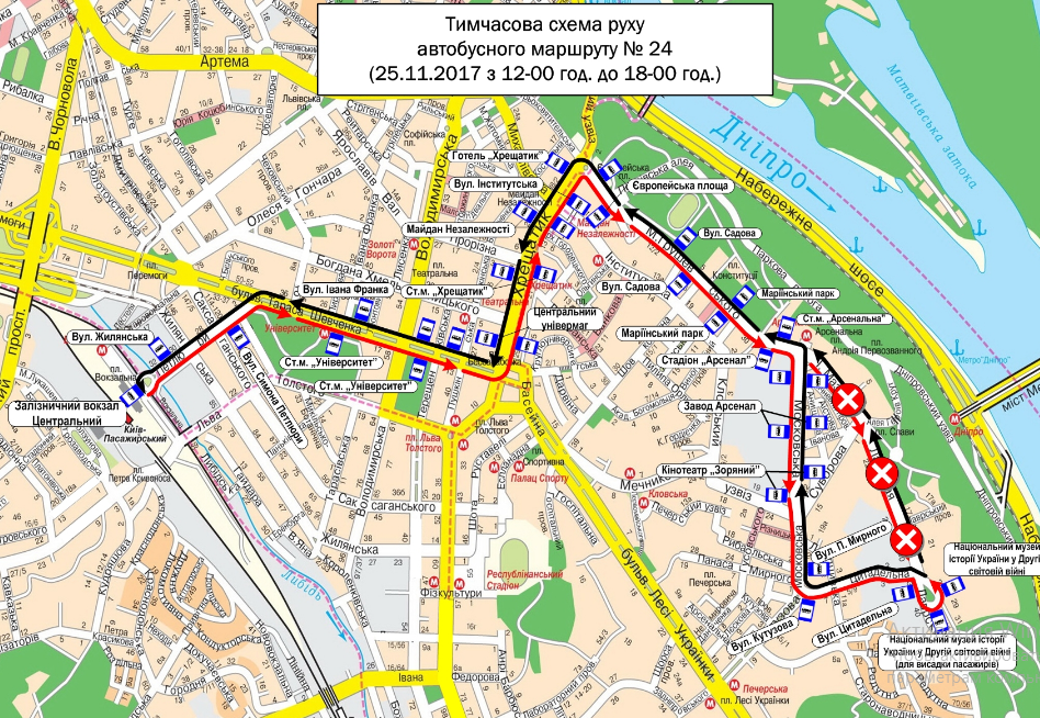 Автобусы № 24 будут курсировать по маршруту: Музей истории Украины во Второй мировой войне - ул. Цитадельная - ул. Московская - ул. Грушевского, далее по действующему маршруту.