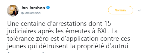 После вчерашней демонстрации в Брюсселе, которая переросла в погромы, задержаны около 100 человек. Об этом в Twitter написал глава МВЖ Бельгии Жан Жамбон.
