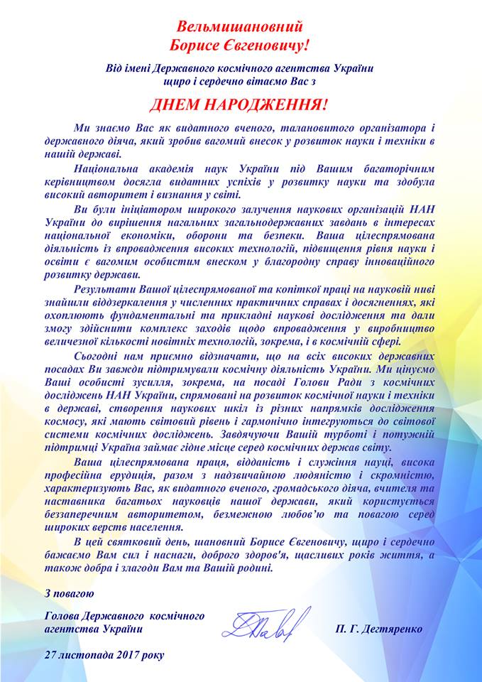 Сегодня, 27 ноября, украинский ученый, известный изобретатель и президент Национальной академии наук Борис Патон отмечает 99-летие. С днем рождения его поздравляют сотрудники Государственного космического агенства Украины на странице в Facebook.