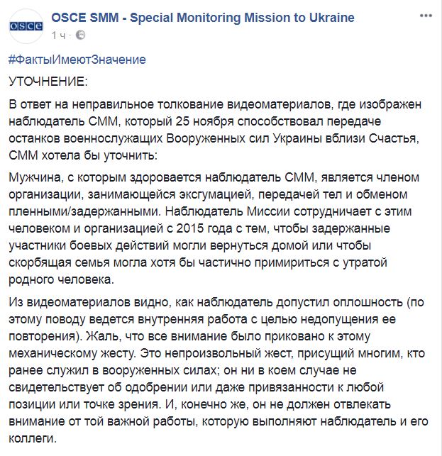 Также в СММ отметили, что представитель т.н. "ЛНР", которому был так рад наблюдатель, является членом организации, которая занимается эксгумацией, передачей тел и обменом пленных и задержанных.