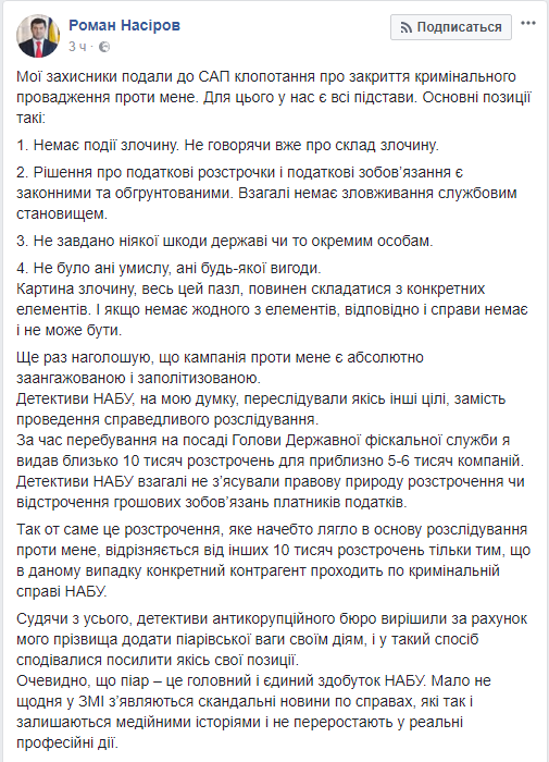 Адвокаты Романа Насирова подали ходатайство в САП о закрытии дела против отстраненного главы ГФС. Об этом он сообщил в Facebook.