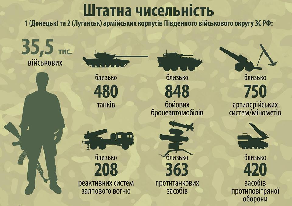 Позже в своем Facebook Аваков поделился конкретными данными разведки. По его словам, сегодня на временно неконтролируемой территории Донецкой и Луганской областей Украины "под видом военизированных формирований так называемых ДНР и ЛНР действует оперативная группировка российских оккупационных войск, в состав которой входят 1 (Донецк) и 2 (Луганск) армейские корпуса 8 Армии Южного военного округа ВС РФ, состоящие из местного населения, наемников и кадровых военнослужащих ВС РФ".