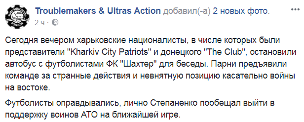 Вечером во вторник, 28 ноября харьковские националисты, в числе которых были представители групп "Kharkiv City Patriots" и "The Club", остановили автобус с футболистами "Шахтера". Об этом сообщили представители сообщества "Troublemakers & Ultras Action".