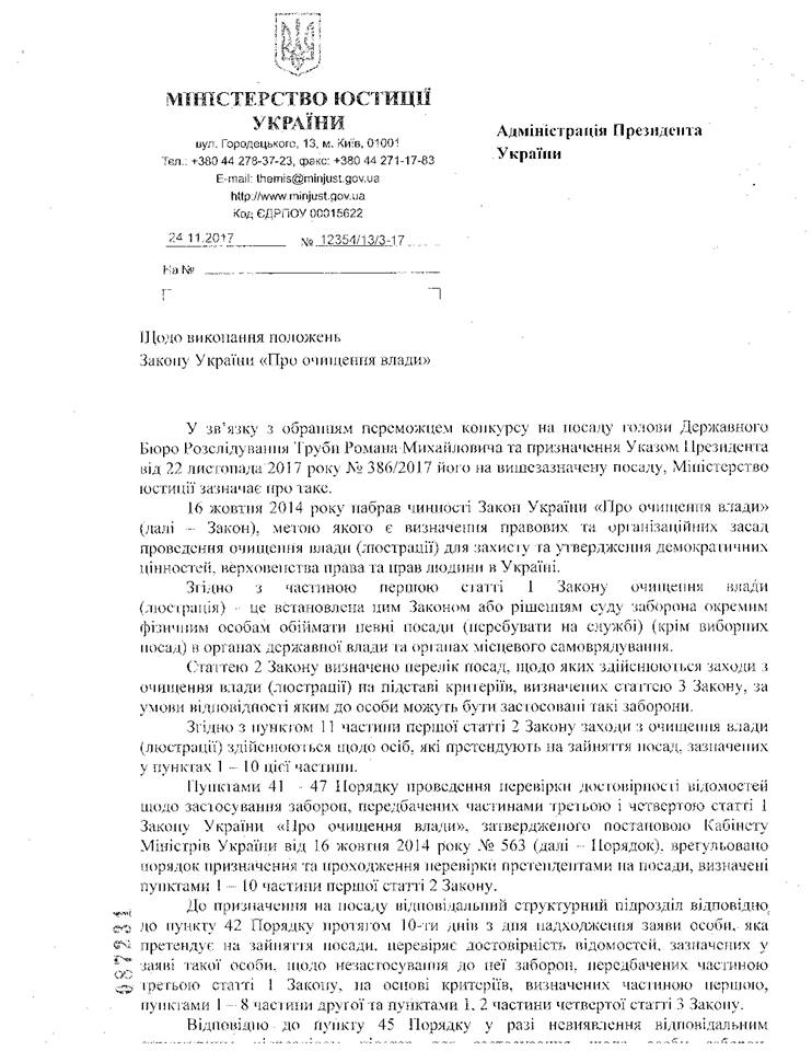 В Минюсте заявили, что директор Госбюро расследований Труба не проходил люстрационную проверку