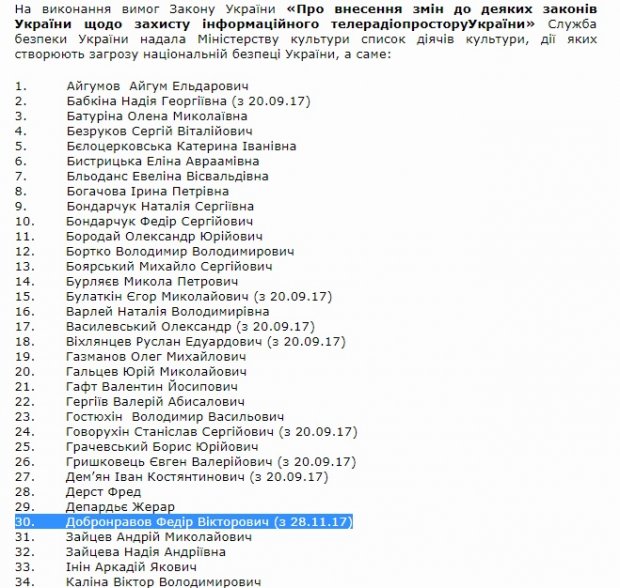 Список Министерство культуры составляет на основании обращений СНБО, СБУ и Национального совета Украины по вопросам телевидения и радиовещания.