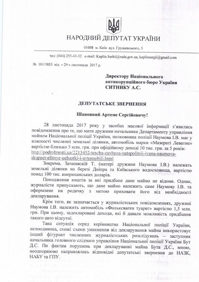 Теща руководителя Департамента имущества Нацполиции Наумова при официальных доходах 10,5 тыс грн за 5 лет- владелица Maserati, земельных участков под Киевом и Николаевом и недостроя стоимостью в полмиллиона. Понятно, что "нахозяйничал" такие богатства полицейский зять. Я обратился в НАБУ и НАПК, чтобы там проверили происхождения средств у семьи высокопоставленного милиционера. Ведь здесь все признаки незаконного обогащения.