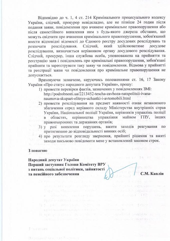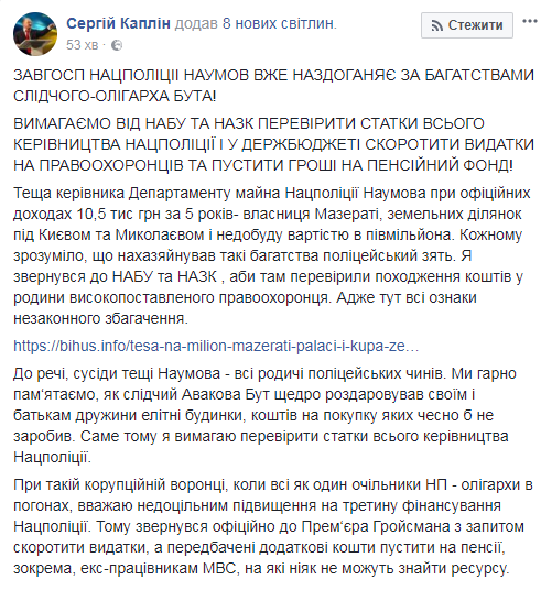 Кстати, соседи тещи Наумова - все родственники полицейских чинов. Мы хорошо помним, как следователь Авакова Бут щедро раздаривал своим и родителям жены элитные дома, средств на покупку которых честно бы не заработал. Именно поэтому я требую проверить состояние всего руководства Нацполиции. При такой коррупционной воронке, когда все как один руководители НП - олигархи в погонах, считаю нецелесообразным повышение на треть финансирования Нацполиции. Поэтому обратился официально к премьеру Гройсману с запросом сократить расходы, а предусмотрены дополнительные средства пустить на пенсии, в частности, экс-работникам МВД, на которые никак не могут найти ресурсов", - написал Сергей Каплин.
