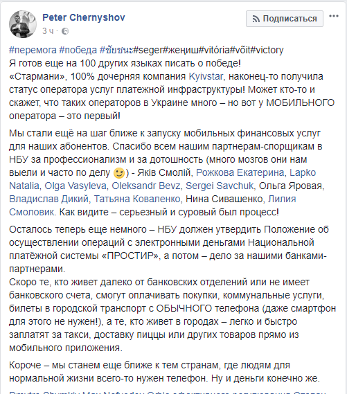 Нацбанк предоставил дочерней компании "Киевстара" - "Стармани" - статус оператора платежной инфраструктуры. Об этом в Facebook сообщил президент компании Петр Чернышов.