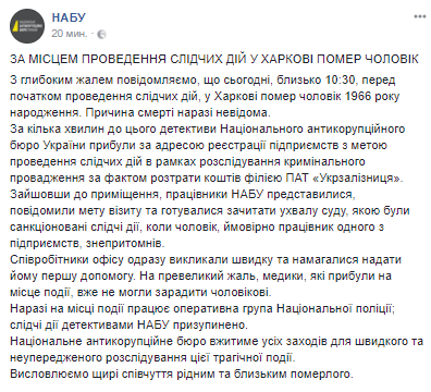 "Зайдя в помещение, работники НАБУ представились, сообщили цель визита и готовились зачитать постановление суда, которым были санкционированы следственные действия, когда человек, вероятно работник одного из предприятий, потерял сознание. Сотрудники офиса сразу вызвали скорую и пытались оказать ему первую помощь. К большому сожалению, медики, прибывшие на место происшествия, уже не могли помочь мужчине", - говорится в сообщении НАБУ.