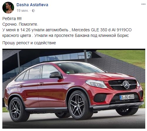 "У меня в 14.26 угнали автомобиль, Mercedes GLE 350 d АI 9119СО красного цвета. Угнали на проспекте Бажана под клиникой Борис. Прошу репост и содействие", - написала Астафьева.