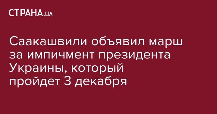 Глава действующей в Украине партии "Рух новых сил", экс-губернатор Одесской области и экс-президент Грузии Михаил Саакашвили призвал своих сторонников выйти на акцию протеста "Марш за импичмент", запланированный на 3 декабря, передает ТАСС.