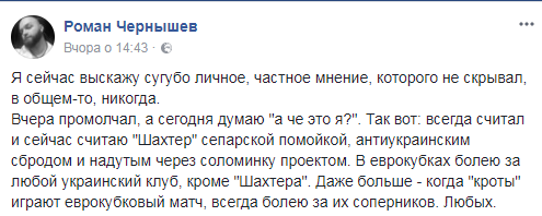 "Я сейчас выскажу сугубо личное, частное мнение, которого не скрывал, в общем-то, никогда. Вчера промолчал, а сегодня думаю - "А че это я?". Так вот: всегда считал и сейчас считаю "Шахтер" сепарской помойкой, антиукраинским сбродом и надутым через соломинку проектом. В еврокубках болею за любой украинский клуб, кроме "Шахтера". Даже больше - когда "кроты" играют еврокубковый матч, всегда болею за их соперников. Любых", - написал Чернышев.