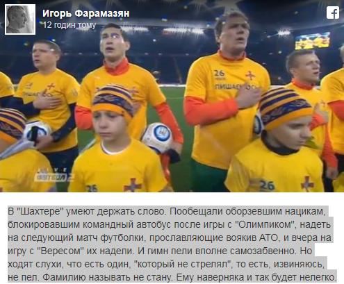"В "Шахтере" умеют держать слово. Пообещали оборзевшим нацикам, блокировавшим командный автобус после игры с "Олимпиком", надеть на следующий матч футболки, прославляющие воякив АТО, и вчера на игру с "Вересом" их надели. И гимн пели вполне самозабвенно. Но ходят слухи, что есть один, "который не стрелял", то есть, извиняюсь, не пел. Фамилию называть не стану. Ему наверняка и так будет нелегко", - пишет журналист.