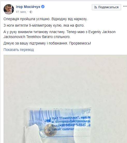 "Операция прошла успешно. Отхожу от наркоза. А в руку вживили титановую пластину. Теперь есть с Евгением Тереховым (ветеран АТО, получивший тяжелое ранение в голову, куда ему потом вживили титановую пластину. – Прим.Ред.) много общего. Спасибо за вашу поддержку и пожелания. Прорвемся!", - написал он.