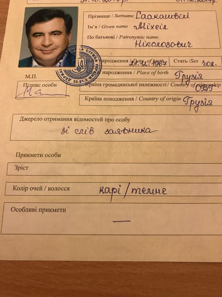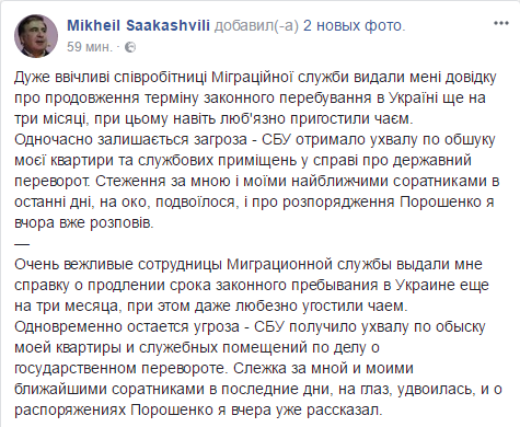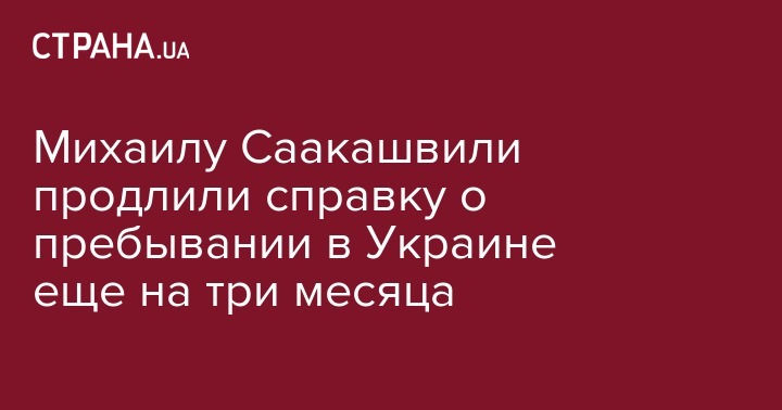 Лидер партии "Рух новых сил", экс-президент Грузии Михаил Саакашвили заявляет, что Миграционная служба Украины выдала ему справку о продлении законного срока пребывания, в Украине на 3 месяца.