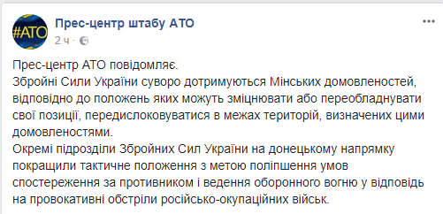 Сделано это с целью улучшения условий "наблюдения за противником и ведения оборонительного огня в ответ на провокационные обстрелы российско-оккупационных войск".