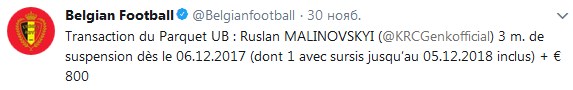 Полузащитник сборной Украины и ФК "Генк" Руслан Малиновский получил наказание в виде длительной дисквалификации за нарушение правил в матче Кубка Бельгии. Об этом сообщает пресс-служба Королевской бельгийской футбольной ассоциации на своей странице в Twitter.