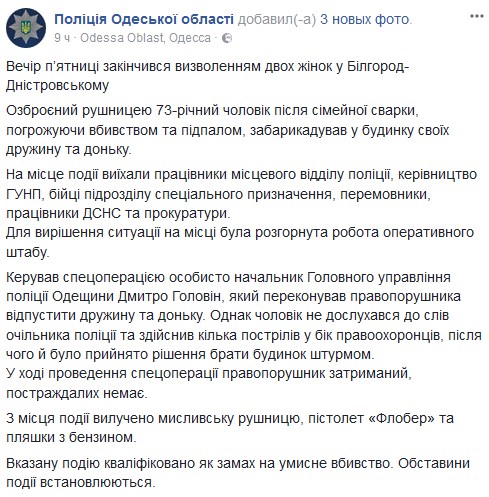 "Около семи вечера в дежурную часть Белгород-Днестровска поступило сообщение. Выпивший местный житель, угрожая оружием, взял в заложники двух женщин. Находясь в неадекватном состоянии, из окна стреляет в прохожих из охотничьего ружья", - сообщил начальник ГУ Национальной полиции в Одесской области Дмитрий Головин.