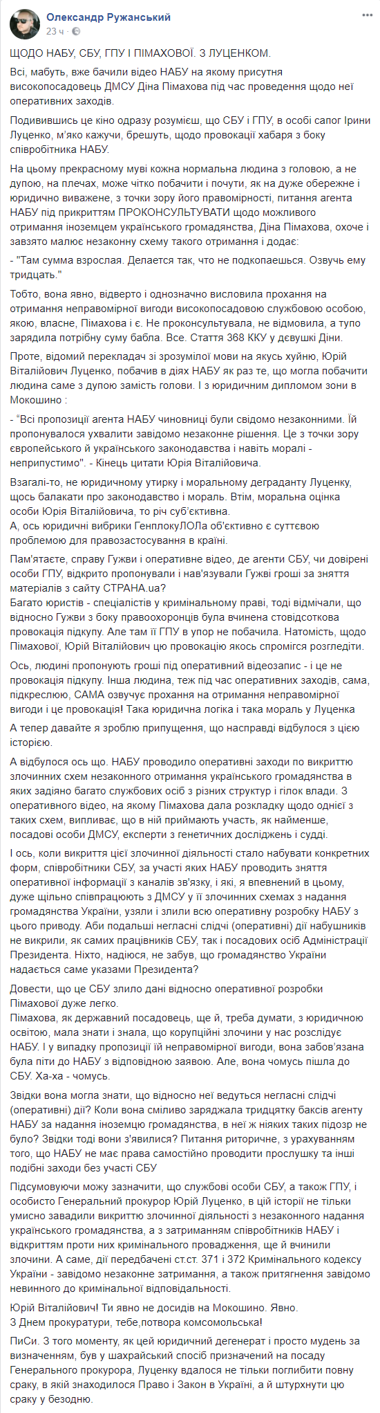 "Все, наверное, уже видели видео НАБУ на котором присутствует чиновник ГТСУ Дина Пимахова при проведении по ней оперативных мероприятий. Посмотрев это кино сразу понимаешь, что СБУ и ГПУ, мягко говоря, врут, о провокации взятки со стороны сотрудника НАБУ", пишет Ружанский.