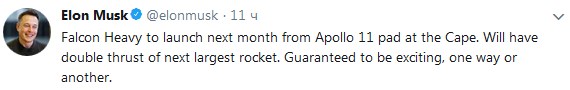 "Falcon Heavy будет запущен в следующем месяце со стартовой площадки Apollo 11 на мысе Канаверал", - написал Маск и добавил, что это событие "так или иначе будет захватывающим".