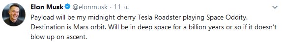 Планируется, что ракета Falcon Heavy отправится на орбиту Марса. По словам главы SpaceX, "полезным грузом" ракеты станет электромобиль Tesla Roadster вишневого цвета, в котором будет звучать песня британского рок-музыканта Дэвида Боуи - Space Oddity.